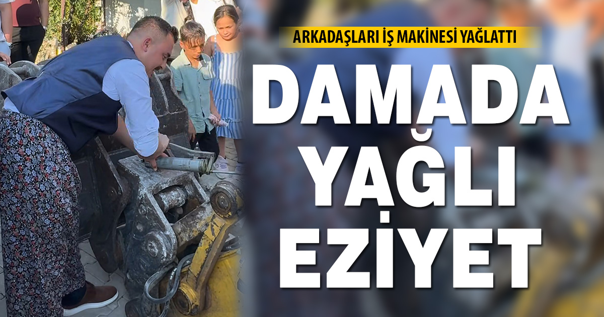 Damat Mert, evin önünde bulunan bir kepçeyi yağlaması için arkadaşları tarafından teşvik edildi. Gres pompası eline verildiğinde, düğün gününde kendi işini yapma fırsatı buldu. Gençler, bu sırada eğlenirken damadın bu durumu nasıl karşıladığını görmek keyifli bir an yaşattı.