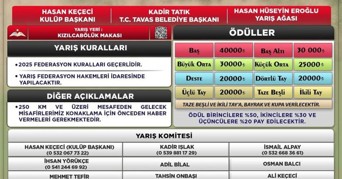 At yarışı tutkunları ve aileleri için kaçırılmayacak bir fırsat olan bu organizasyon, Tavas’ta sosyal bir buluşma noktası haline gelecek. Yarışmanın başlamasına az bir süre kala, tüm hazırlıkların titizlikle tamamlandığı öğrenildi. Hem katılımcılar hem de izleyiciler için unutulmaz anların yaşanması hedefleniyor.